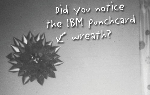 We had several of these when I was young. I think we made them in Girl Scouts. You take IBM punchcards and fold the corners on one end into points, then glue them in a circular fashion onto a paper plate. Then you buy one of those highly flamable toxic cans of gold spray paint and hopefully go outside and spray away! We also made wreaths out of warped 78 RPM records. Kids nowdays are making stuff out of cds, weird, hey? :^) Are you STILL there?
